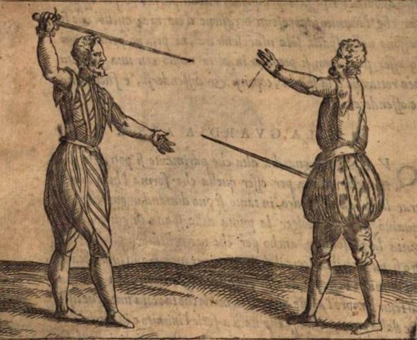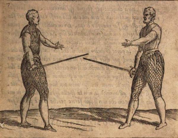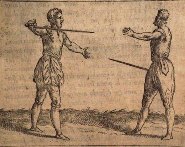 Whereupon he that would give either an edge blow in a great compass, either thrust with the point of the sword, must not only be nimble of hand, but also must observe the time of advantage, which is, to know when his own sword is more near and ready to strike than his enemy’s.