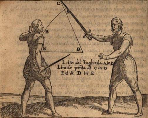 because the Arm widening and stretching itself directly as much as possible from the right side, bears the sword so far off from the body, that it seems to give great scope to the enemy to enter, albeit in truth it be nothing so. For although the hand and the handle of the sword, be both far from the body, and quite out of the straight line, yet the point of the sword, from which principally proceeds the offense, is not without the said line…