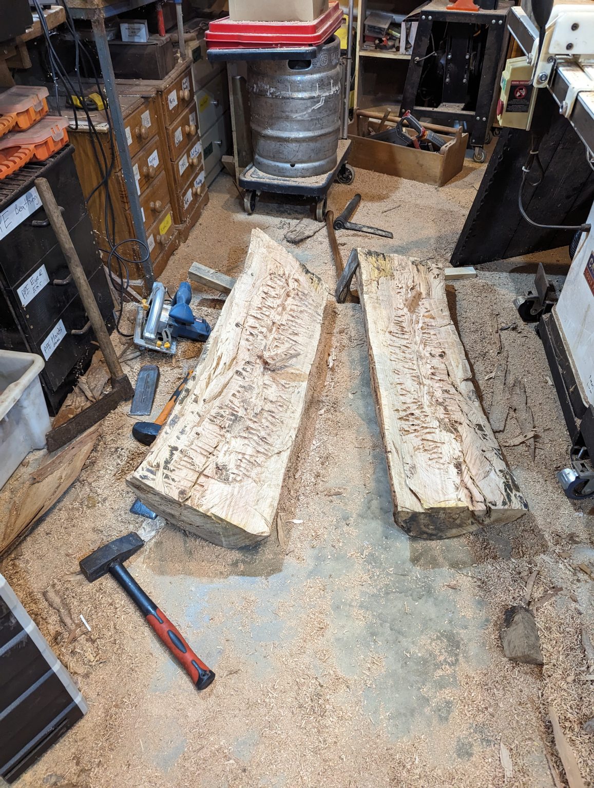 In trying to be as authentic as I can, I spent some time cutting a log in half and trying to plank it. The wood is a native tree, likely River Red Gum. The grain was spiralled around rather than straight. Not only is this wood very hard, the grain made it difficult to work with.