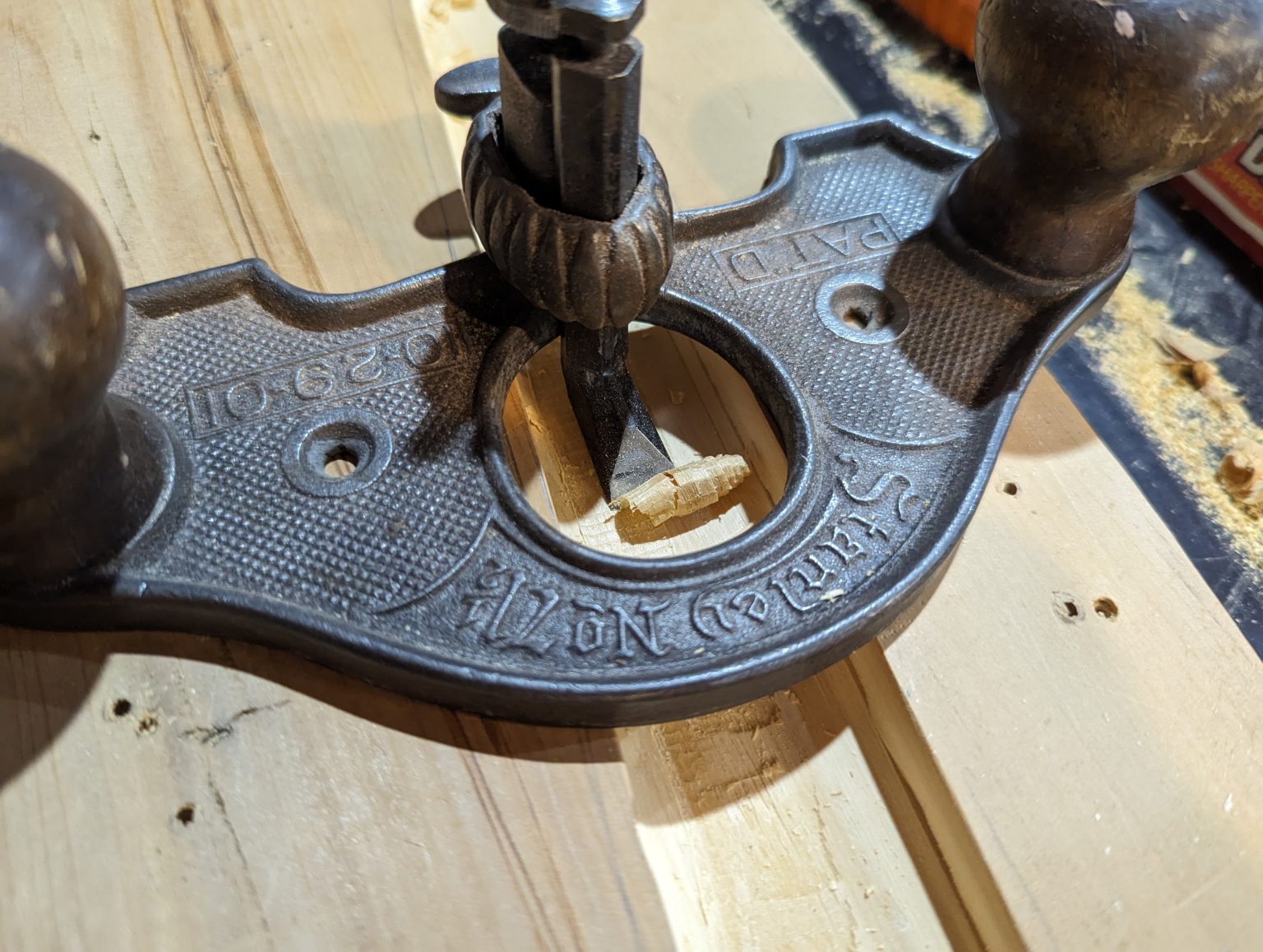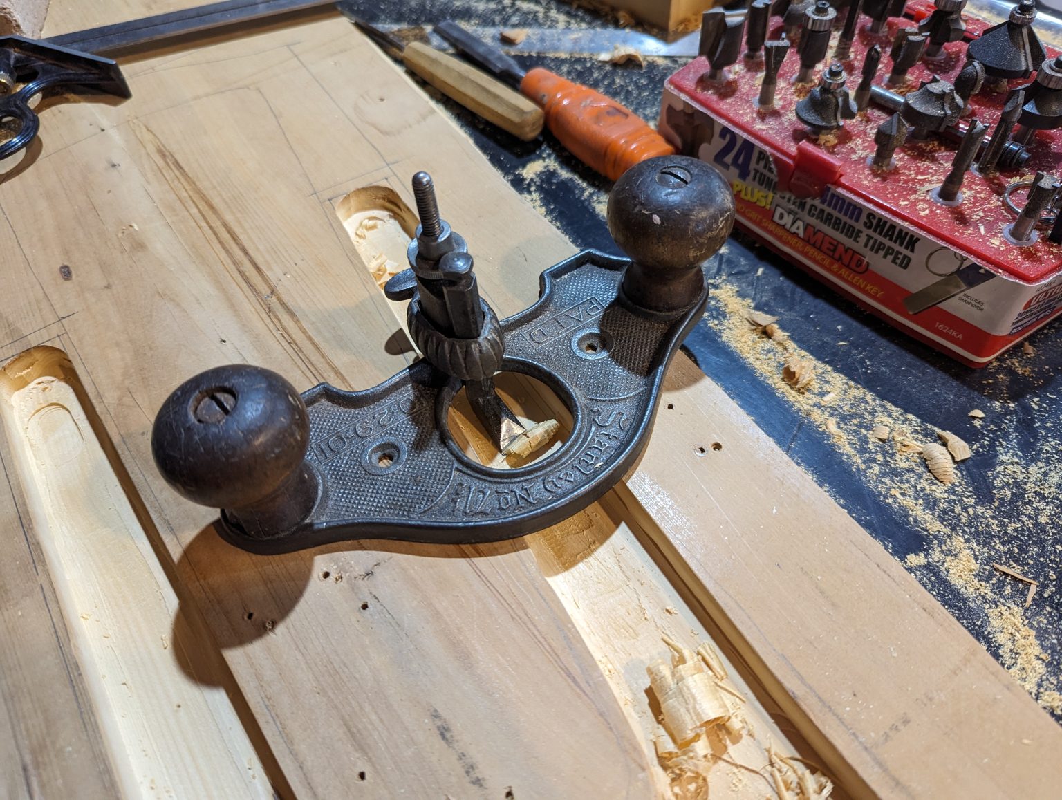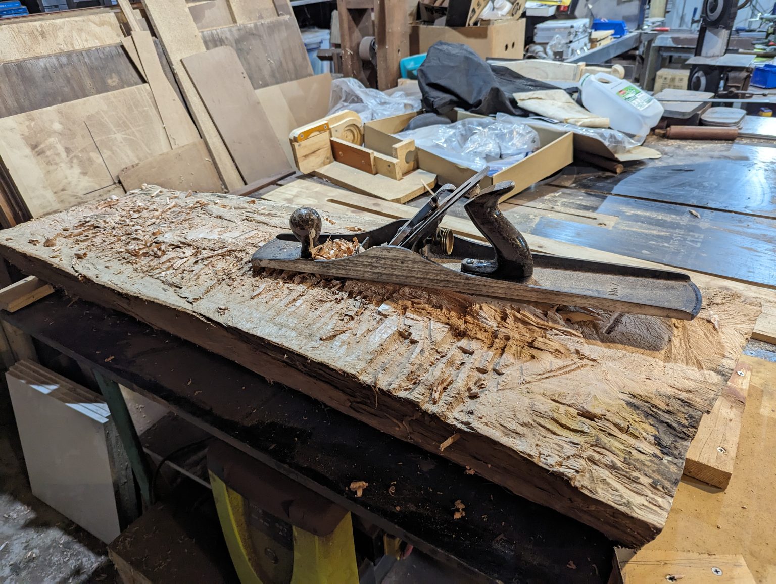 The first picture is the splitting of the log. It really didn’t want to split nicely. I attempted to cut guides for the split, and resorted to drilling the core perpendicullarly so that I could split it. I cleaned up much of the centre with chisel and mallet, before planing with a Number 7 Jack Plane.