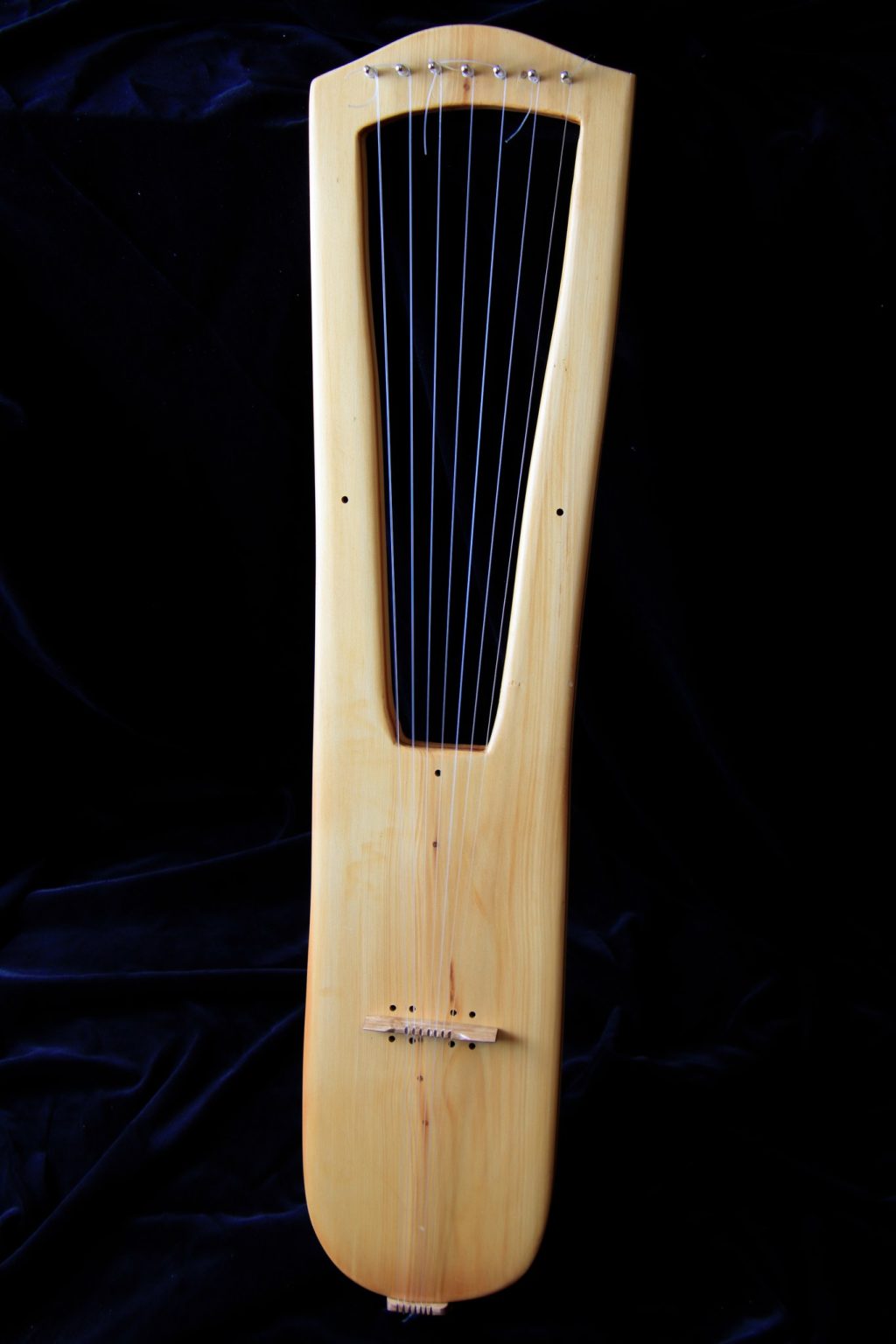 I created an A shaped bridge with 7 notches in it, like the original. I played around with the idea of how to get 2 strings off one peg so that I could have the 6 pegs as per the original and use all 7 notches, but elected to instead just add an additional peg for 7 separate strings.