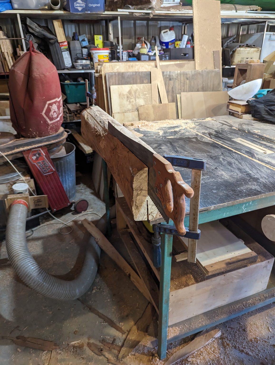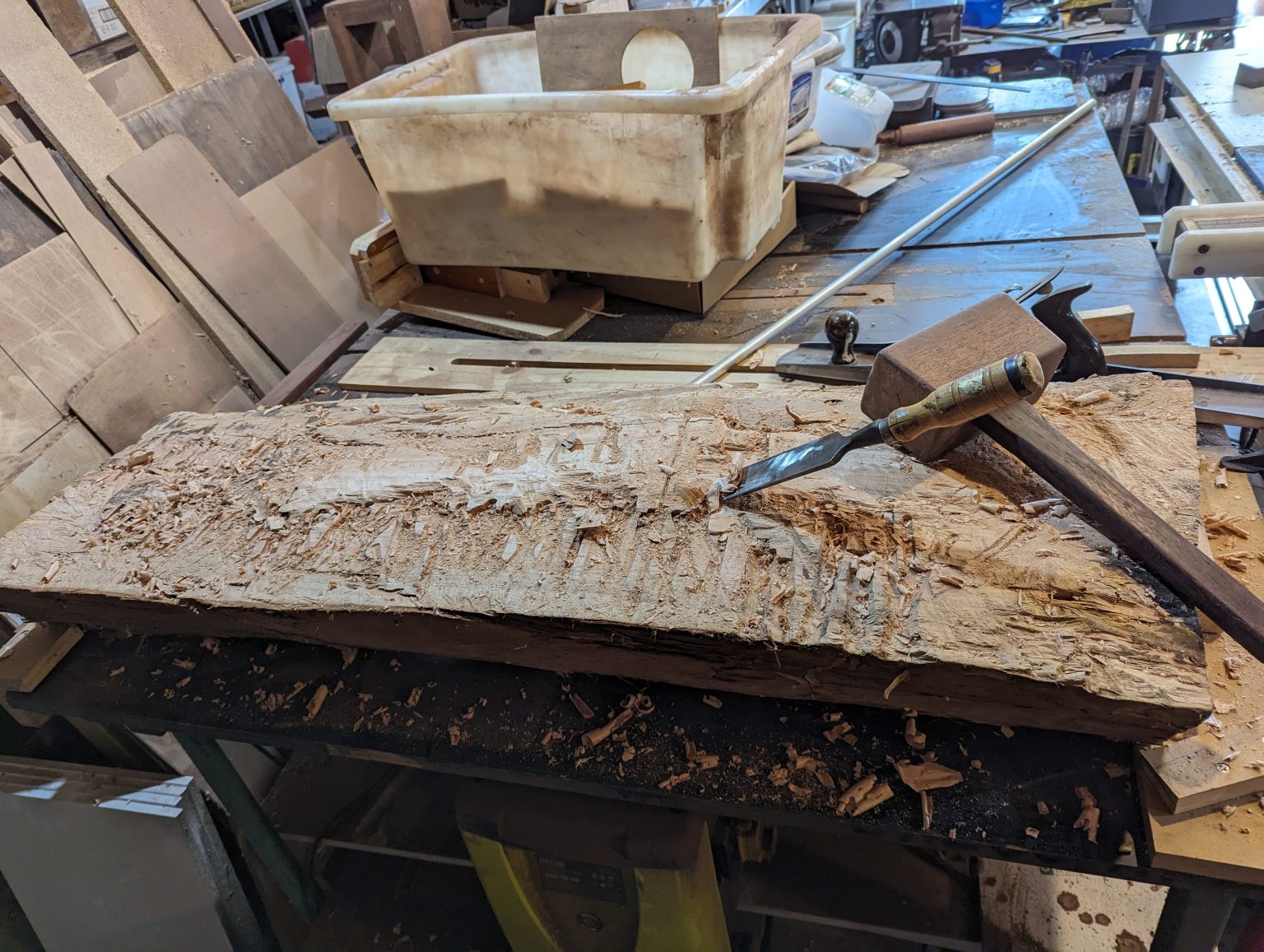 Progress was going slowly, but I was making it flat. I cut a plank off with a combination of various saws. Again, this wood was very resistant. The grain in this log was quite twisted.