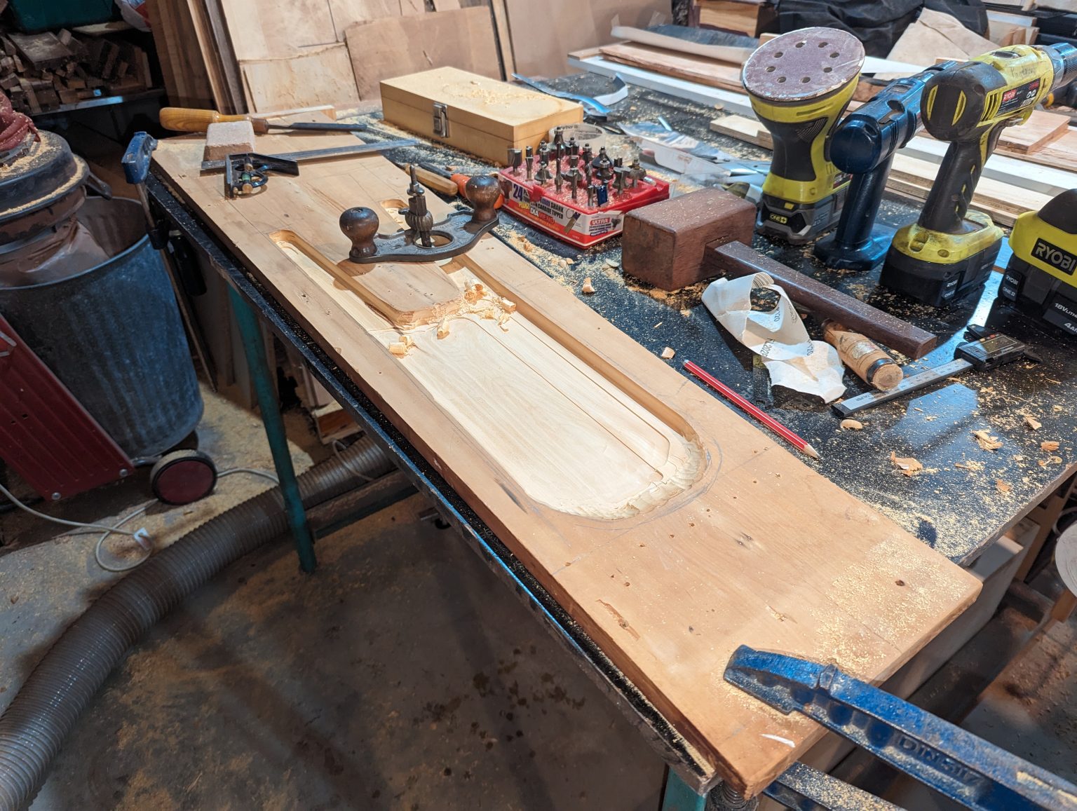 Using one plank, around 20 mm deep, I laid on the printout template, cut to the outlines, I pencilled the outline directly onto the board. I gave myslef an initial 10 mm inner boundary for the cavity section. I used an electric hand router to hog out most of the inner wood and used a hand plane to smooth out and micro adjust the depth. Overall, I made it too thin on the back wall, so I highly recommend that if you make one of these, you get no thinner than 3 mm in the centrte, and 4 mm towards the edges. I curved the transition between the horizontal and verticle to minimise the risk of cracking.