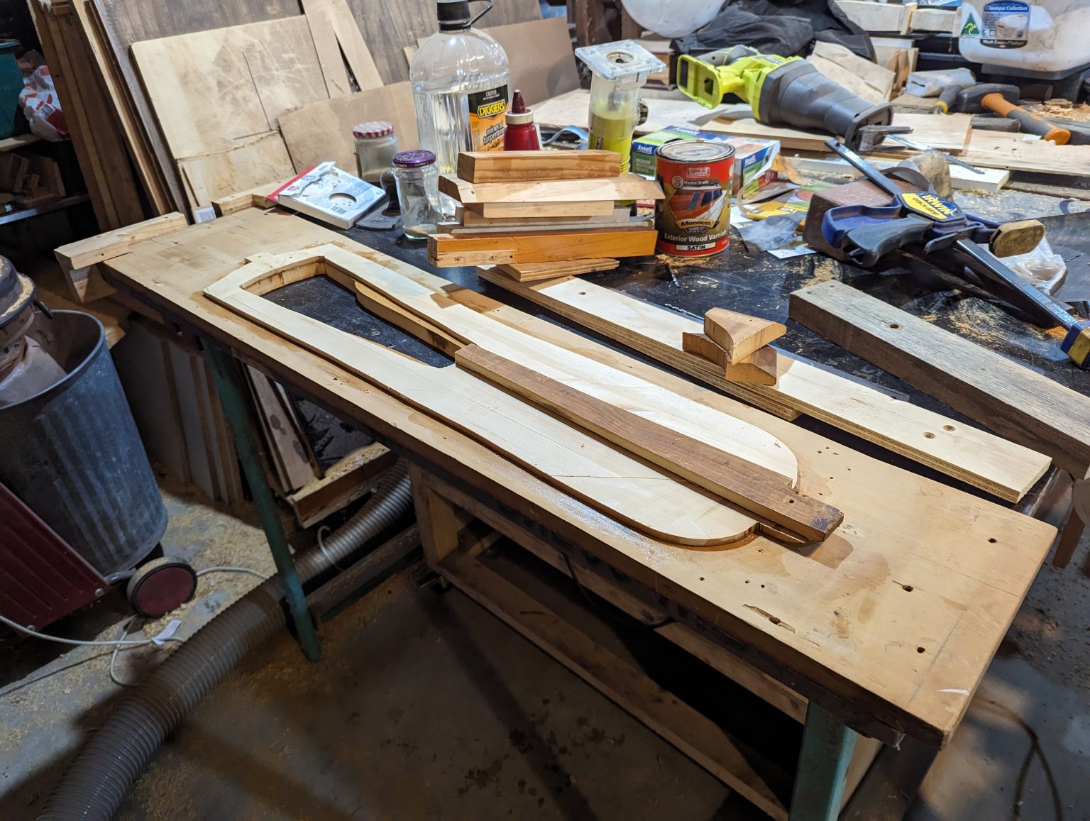 The outside excess wood was cut off and I had my laminated two layer lyre shape with a hollowed out soundbox. Shaping was done via a spoke shave, planes and sanding.