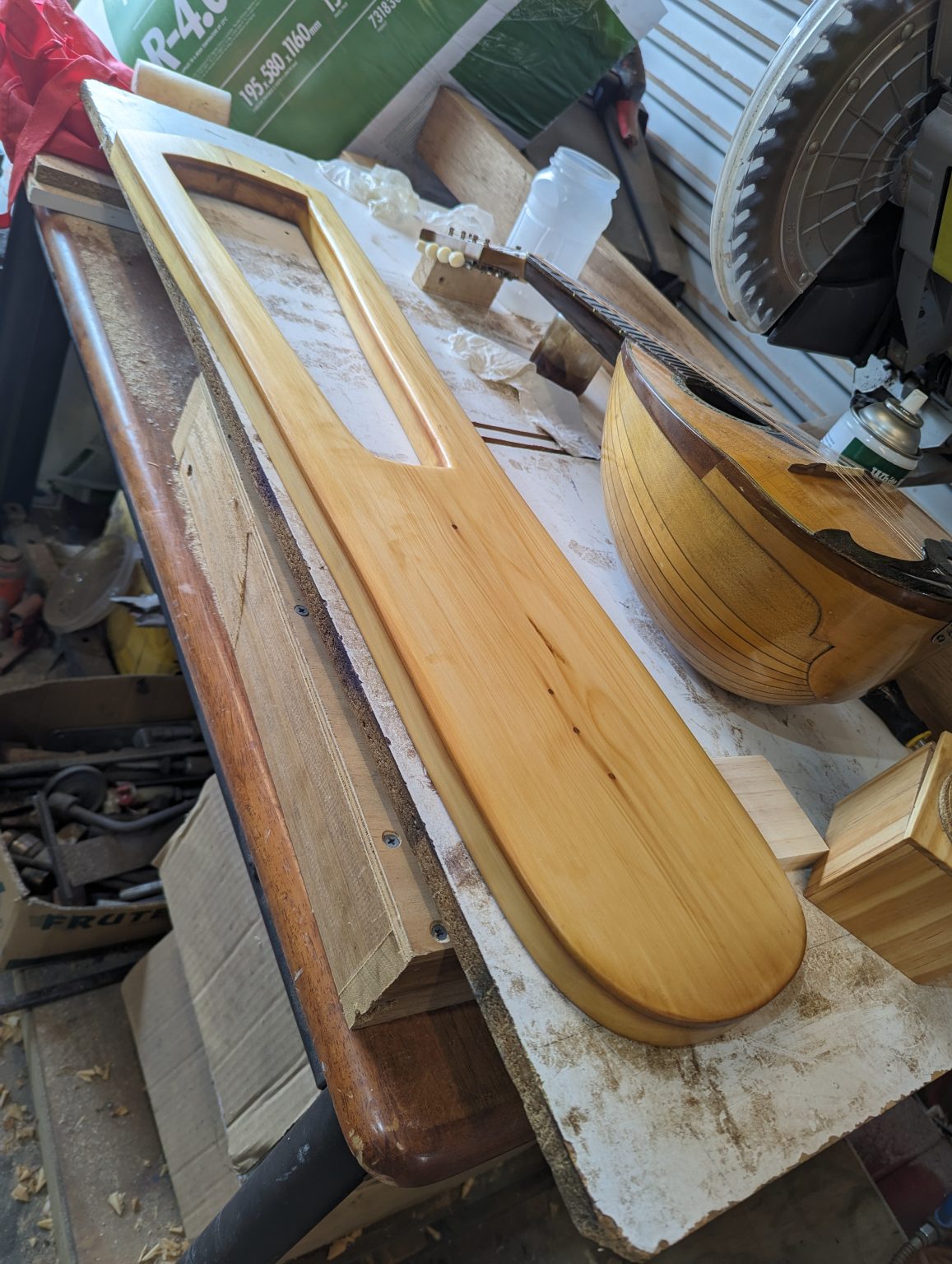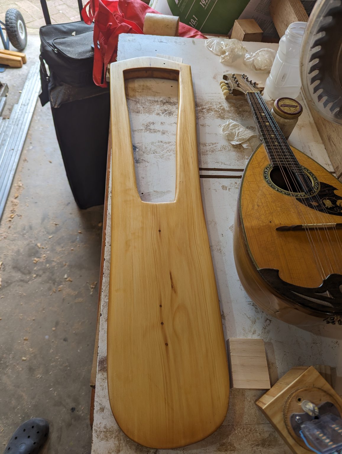 You can see a mandolin in these photos as I got my head around how the sound box best works and looking for inspiration for how the strings should be attached. We don’t know how that was done on the original extnant version. Some people use a floating stick to tie the strings to, some people have tied them all to a base peg and the third version I’ve seen is a similar method to the mandolin. I went with that version, creating an L shaped piece of wood with holes in it to hold the string. I shaped the L bracket to fit the base of this lute.