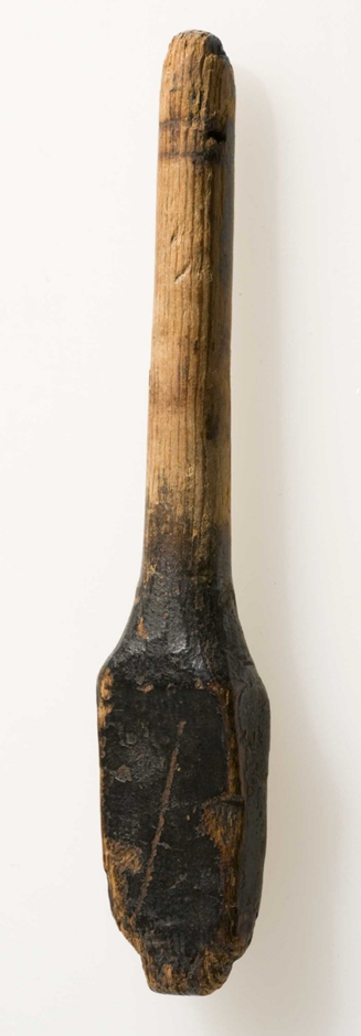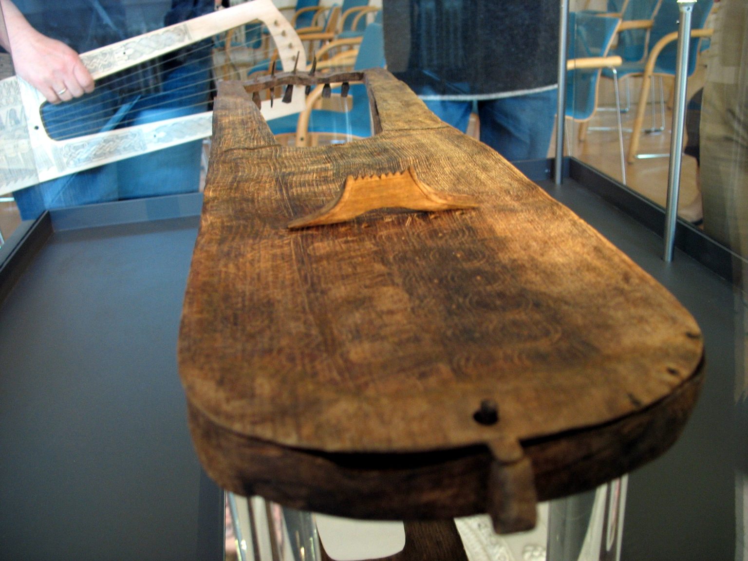 Six tuning pegs for tensioning the strings sit on the head. Four are made of ash and two from hazel. The bridge is made of will wood. There is leather residue on th lower endso f teh yoke arms, indicating a kind of strap to retain it to the musician. The strings did not survive, but are thought to have been made of animal gut.