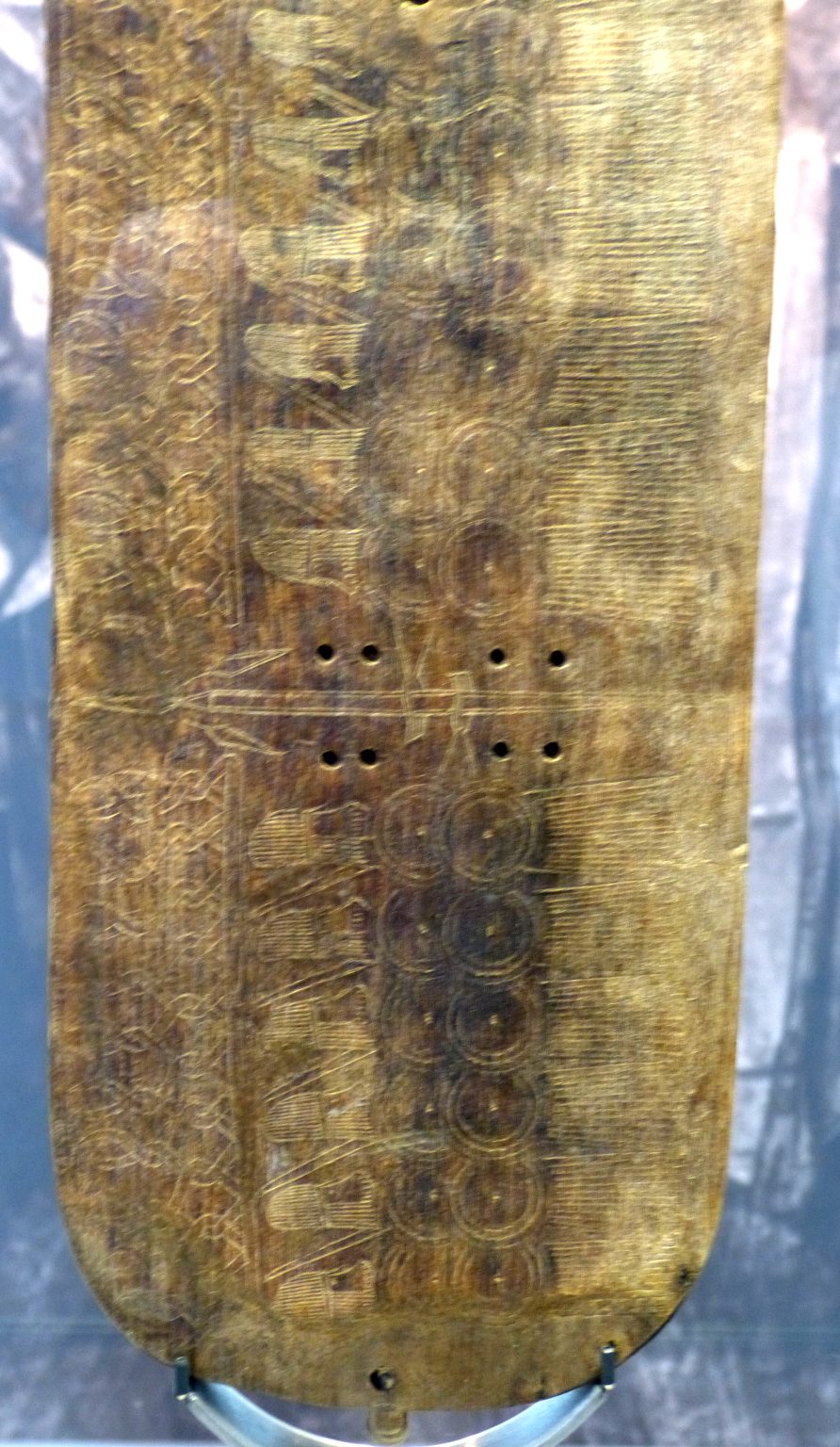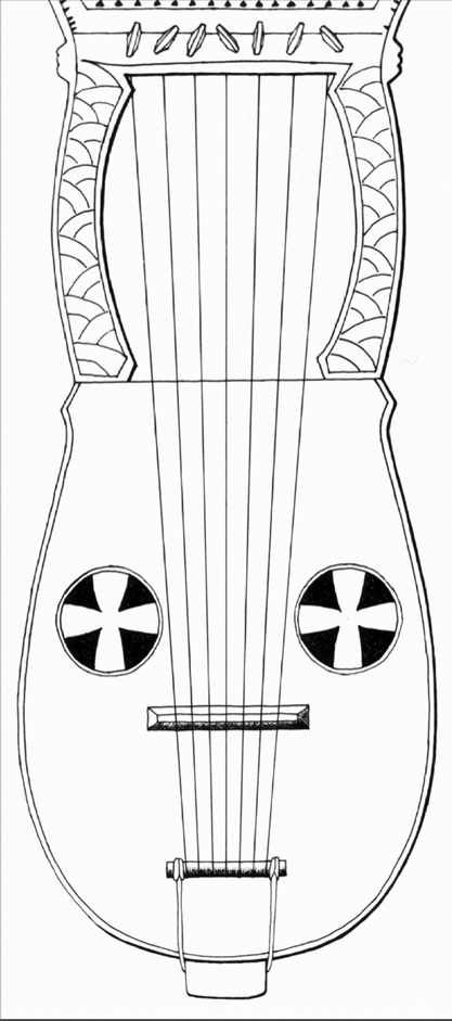 There is a design scratched into the surface of the upper laminated layer that is armoured people holding shields and spears or swords. Half the warriors face in the opposite direction, both towards the bridge. Above the warriors a knot like design is split by the artwork that holds the bridge between the 8 central sound holes. Two more sound holes are at the top of the sound box on the arms, 1 at the meeting of the two arms, and one at the bottomof the sound box at the base of the lyre. On the back side (not shown), a disign of braided lines forms 44 snakes.