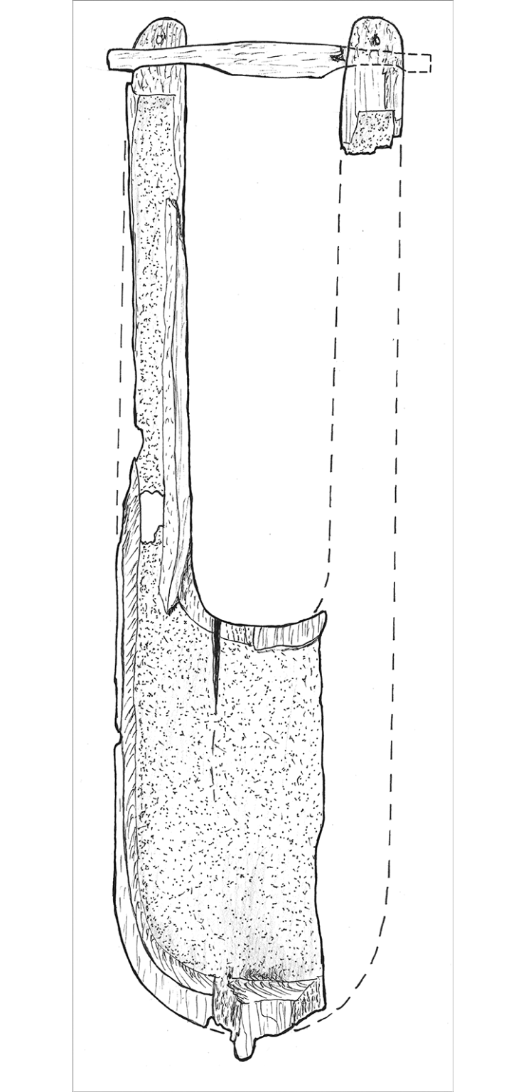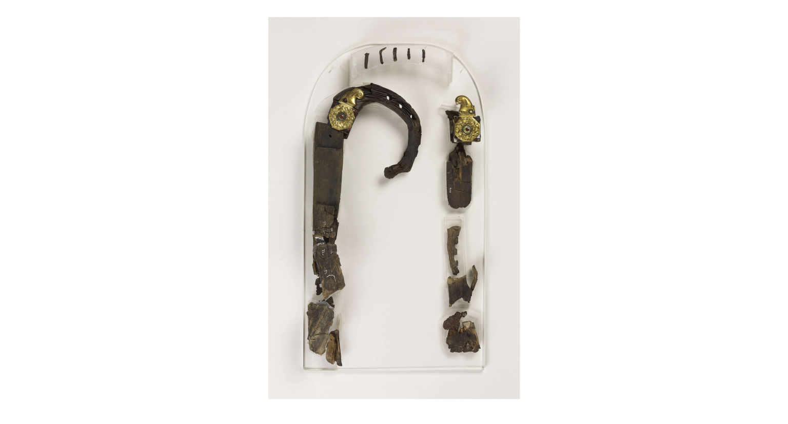 These are similar to some extent to the Sutton Hoo bits of musical instrument, and now considered to both be forms of Lyre. Half of the Lyre was remaining in a dig. Below is a sketch of that Lyre. The dotted lines indicate speculation on missing parts.